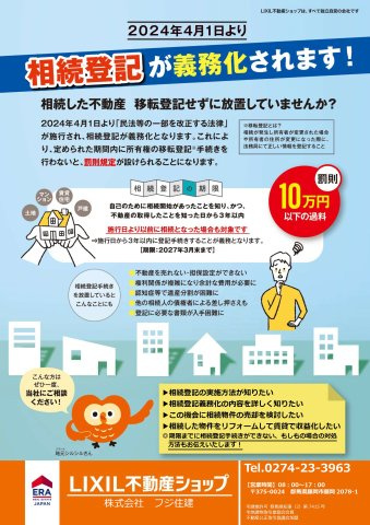 | 2024-08-28 | 『買いたい家がある。住みたい家にする』のLIXIL不動産ショップです。 【お知らせ!】 今年の4月1日から相続登記が義務化になりました。 定められた期間内に所有者の移転登記などの手続きを行わないと、罰則規定が設けられる可能性があります。 ![]() 相続登記の実施方法が分からない方などおりましたら、是非お問合せください! ********************************************************************************* 藤岡市・高崎市・伊勢崎市・太田市・桐生市・みどり市・本庄・上里・神川の土地・建物のご売却、ご購入、管理など、不動産一式のご相 談は地域密着のフジ住建へ!建築のことなら、新築・リフォーム・リノベーションのワンストップサービスを展開する地域密着のフ ジ住建にお任せください! *お家を売りたい方必見!今なら無料査定でVポイント1000ポイント贈呈! ********************************************************************************* |